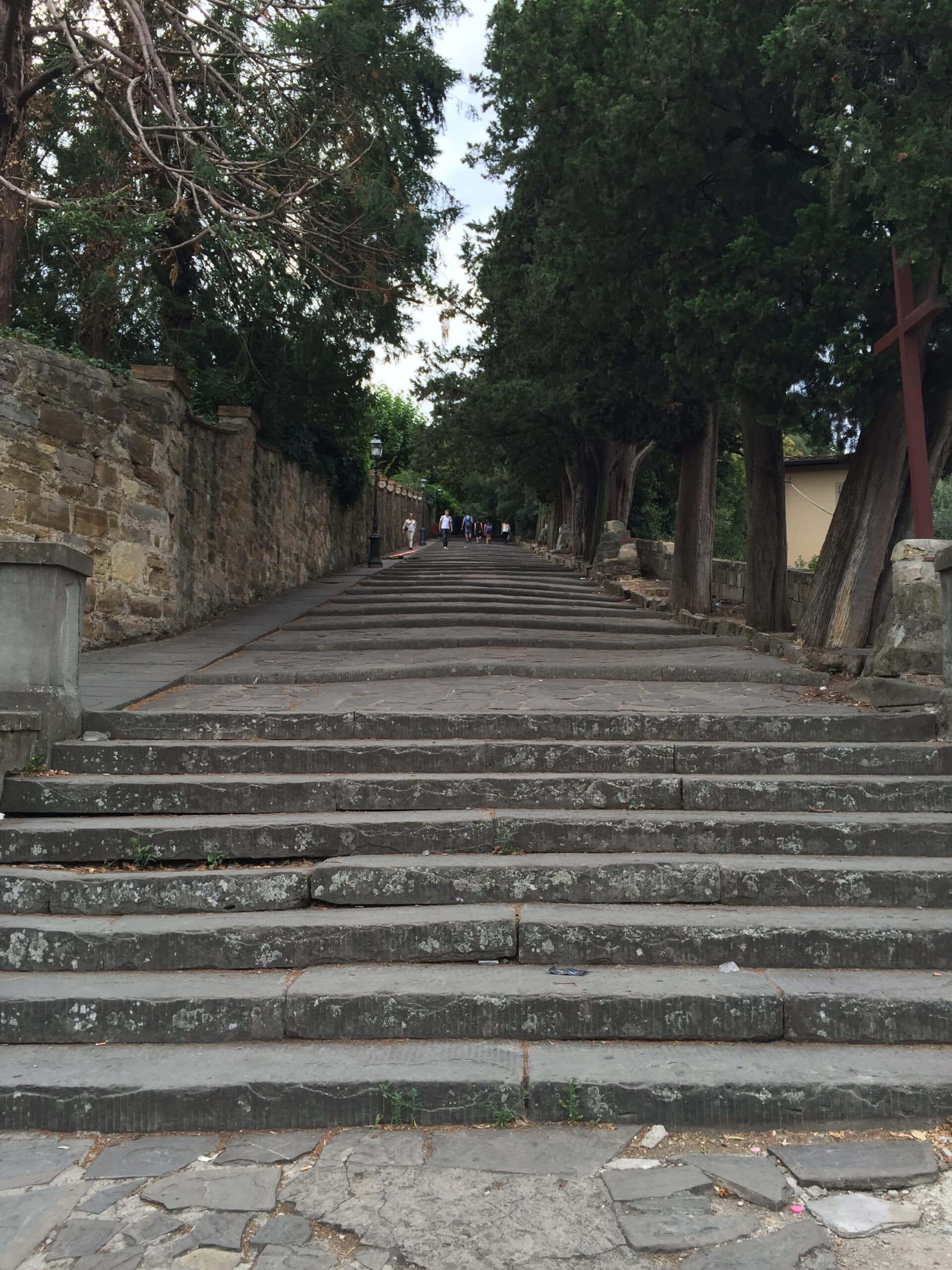 Per giungervi a piedi, dal centro della città e più precisamente dal ponte vecchio, sono sufficienti una ventina di minuti …e un pò di fiato per affrontare le scalinate che conducono, dapprima, al piazzale Michelangelo e poi al sagrato della chiesa.